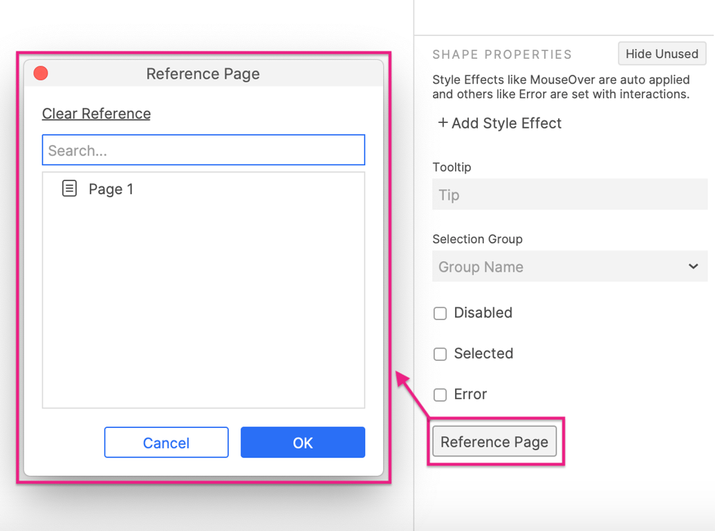 要将参考页分配给形状元件,在 Interaction 面板的 Shape Properties 部分点击 Show All ,然后点击 Reference Page 。