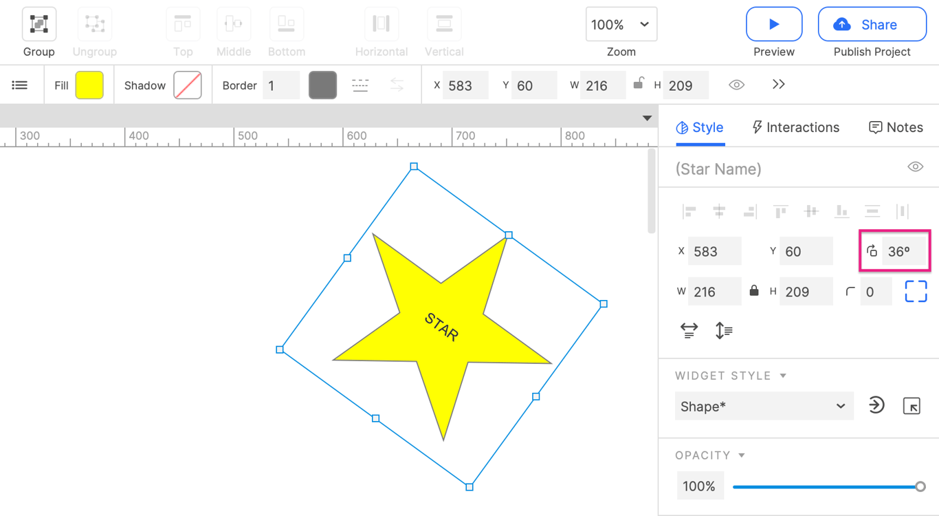 使用 Style 面板顶部的 Rotation 字段来旋转画布上的选定图形。这个字段接受正负度的数值,最多有两位小数。正值将形状向右旋转,负值将形状向左旋转。